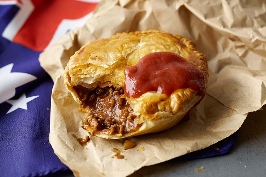 Pie: Meat pies, a common snack especially for tradesmen, sold from any good bakery or service station.