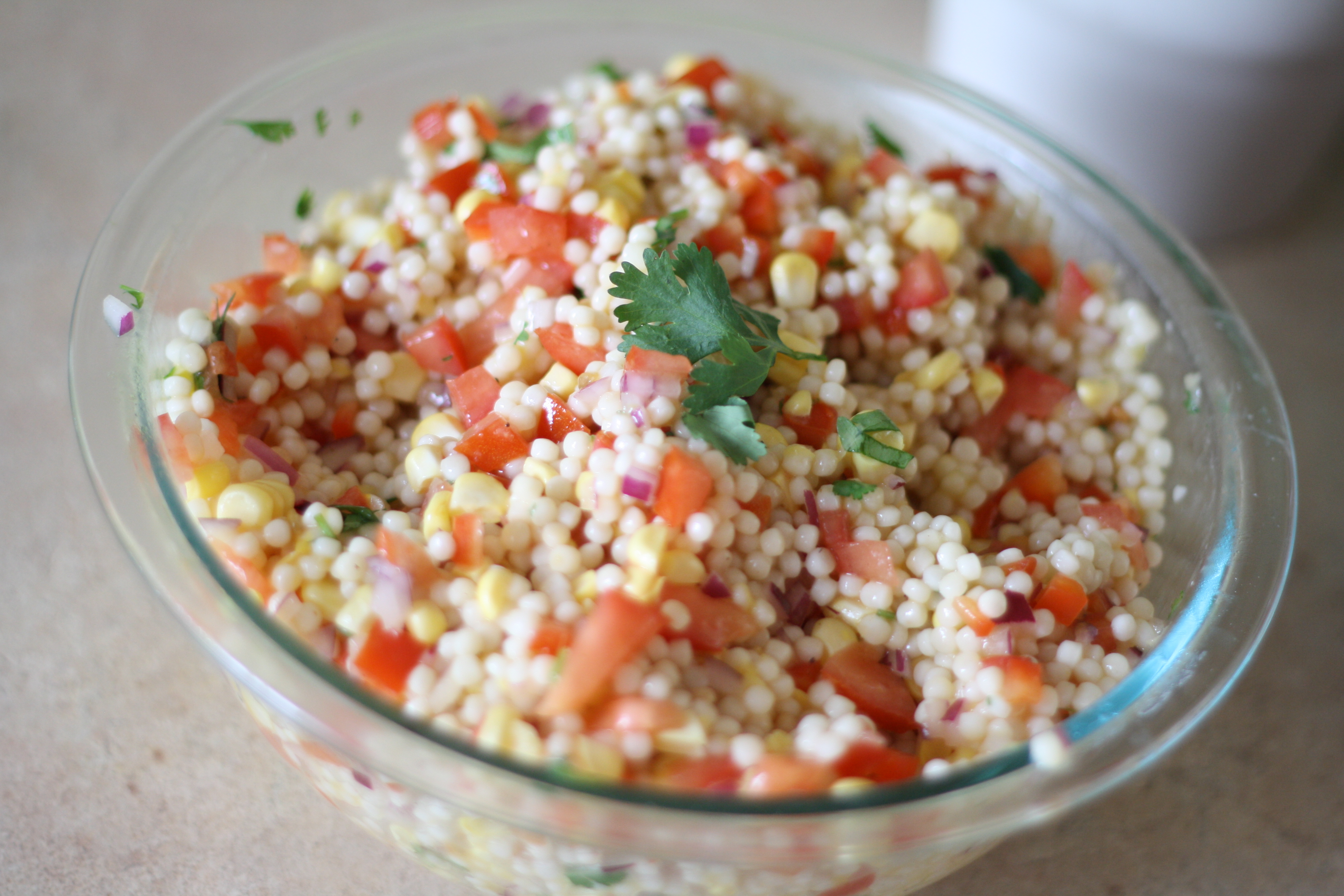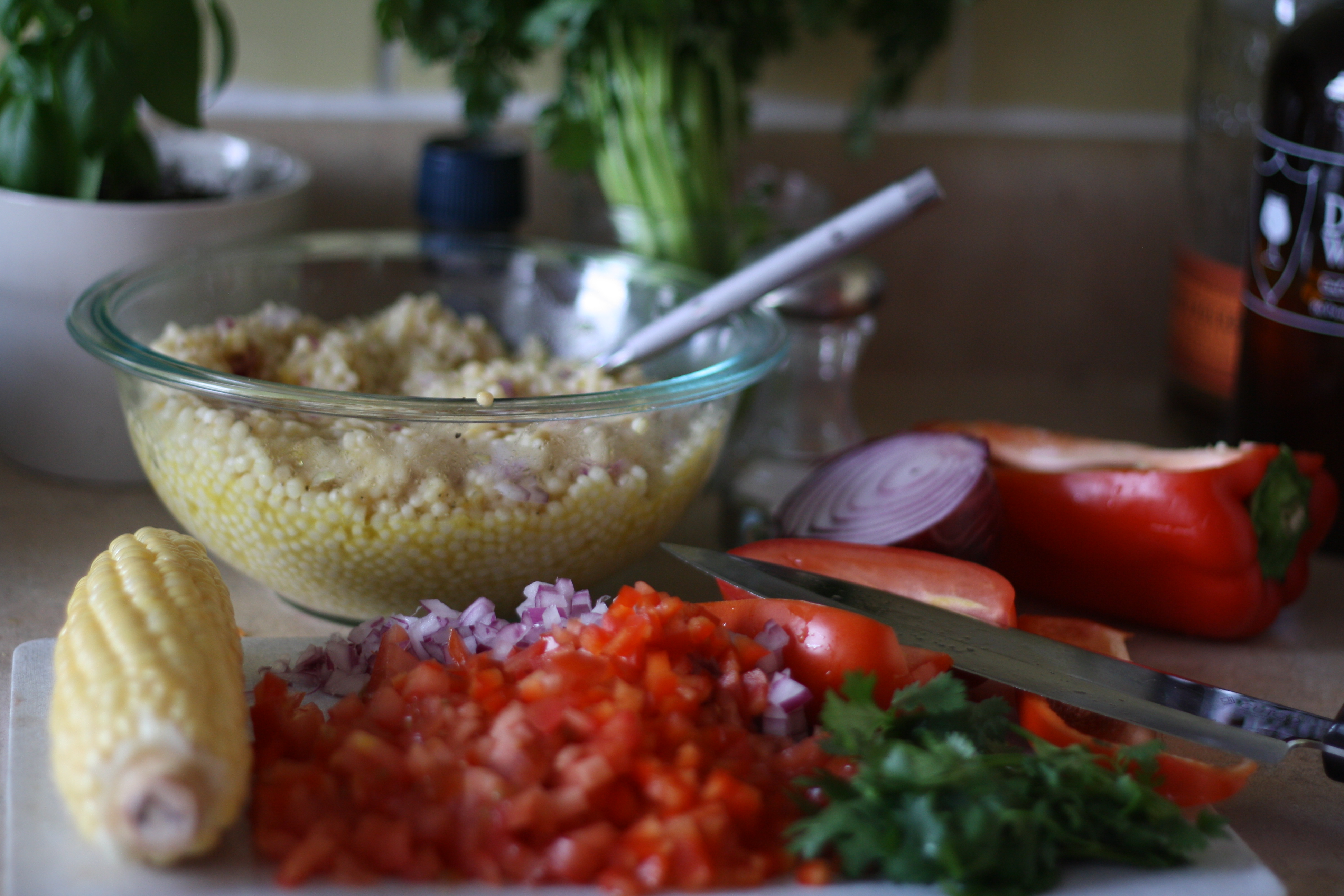 - When most the liquid has been absorbed, fluff the couscous with a fork and add the finely diced onion, tomato, capsicum, herbs, almonds and the corn kernels. You could use any combination here – I’d like to try it with sliced snow peas or sugar snaps and diced zucchini. Taste for final seasoning and serve warm or cool. Fresh and delicious!