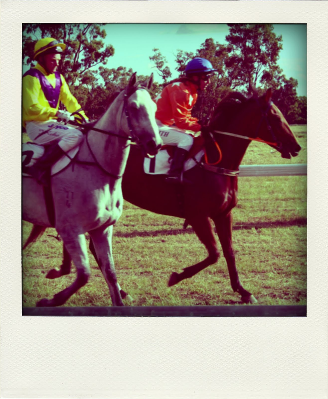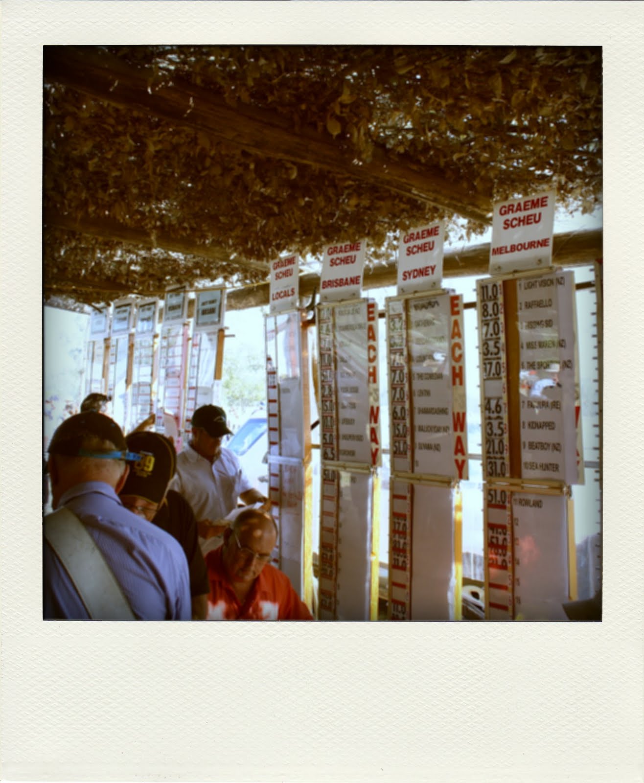 The Flinton Easter races are held on a station a few minutes out of Westmar. There’s a shed, a bar, and the stables and betting ring are simple structures with rooves of box leaves and branches, added to year by year. A handful of bookies make the trip out and run the odds old-school style – all pens and paper and gladstone bags, no computerised systems and (I could be wrong) no trifectas for gawd’s sake.